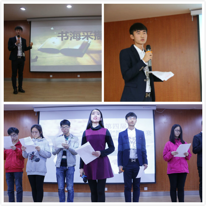 决赛伊始,十位选手带来集体诗朗诵,把观众带入诗的境界,让大家初步领略了他们的阅读风采。随后进行的便是比赛的第一环节:书海采撷,要求参赛的每组选手根据决赛前的抽签顺序依次上场,通过演讲的形式介绍自己对该书籍的理解认识、收获和感悟。五组选手分别选择了《天龙八部》《小王子》《飞鸟集》《海子诗全集》《人生》进行讲述。《天龙八部》的快意恩仇带我们走进了金庸的武侠世界,走入他们的“江湖”,体会那段侠骨柔情,英雄豪迈的霸气。《小王子》带我们走进童话故事,让我们知道了世界上最重要的东西是什么,凭借借小王子的想象力,我们暂时忘记属于大人世界的欲望,飞回童年,并反思现实生活,发现人生的真谛。在《人生》的分享中,让我们理解了那些偶然也是必然的情,理解了那些不平等的爱,理解了那些需要门当户对却义无反顾的爱情。七号选手李仲楠以看似随便的两个字--“好吧”为主题,带我们走近海子,走近他的诗歌,走近他的理想,走近他的无奈,好吧,也只是走近。演讲结束后,由选手的搭档上台向对方进行提问。都说书海遇知音,每组选手强大的阅读量和的默契度也是让场下观众唏嘘不已。