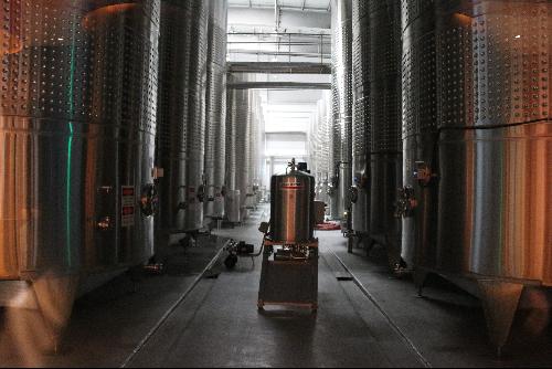 进入参观区,入眼是一面独具特色的墙壁。波浪形的灰色墙壁上嵌入了一根根小石桩,旁边是一面土黄色的墙壁。酒庄负责人告诉队员们,这面墙是冬天葡萄园的写照:银川的冬天少雨寒冷,需要把葡萄藤埋到土里以避寒冬;另外,一灰一黄两面墙壁,也寓意着酒庄的明天更加辉煌。