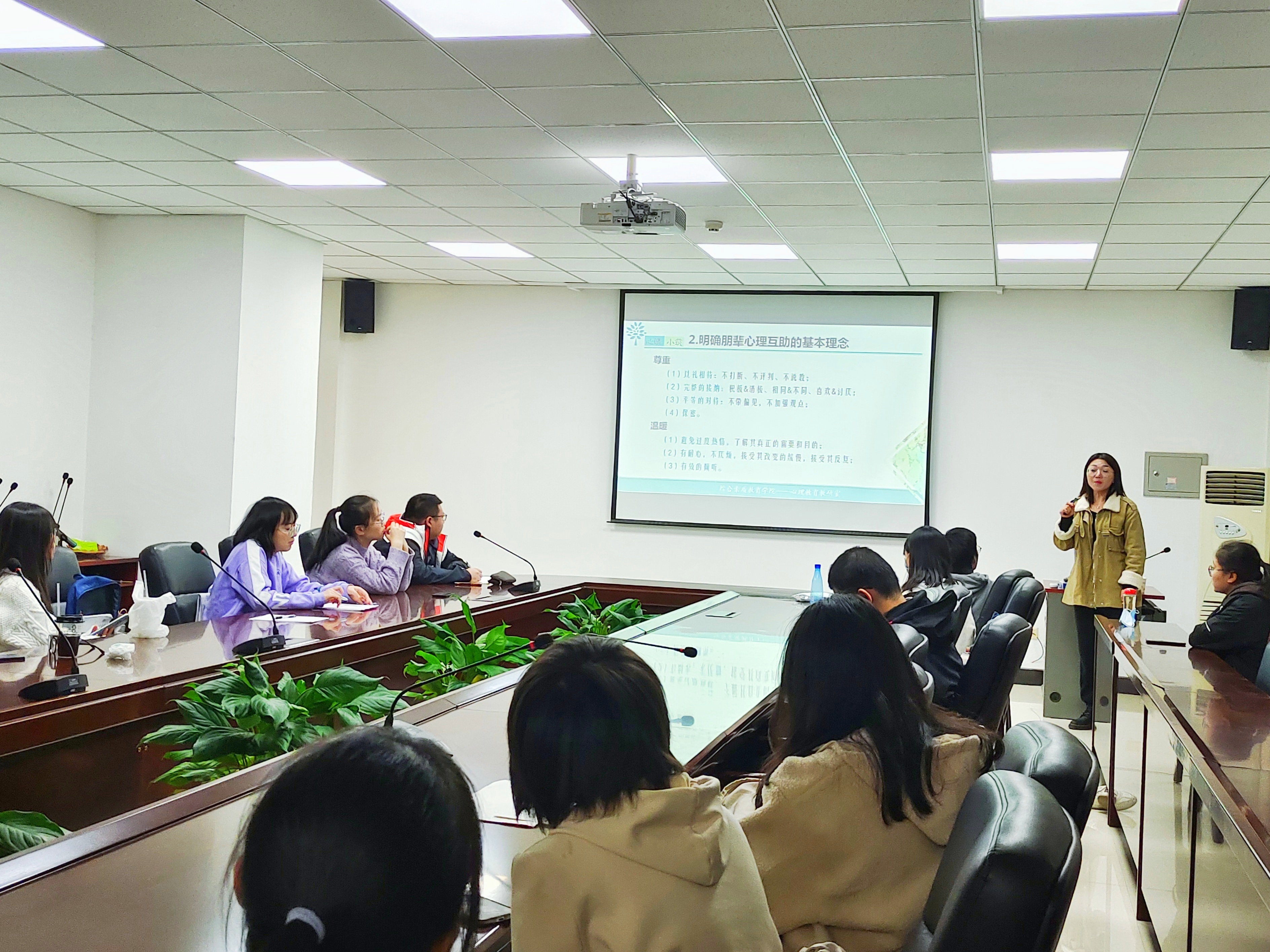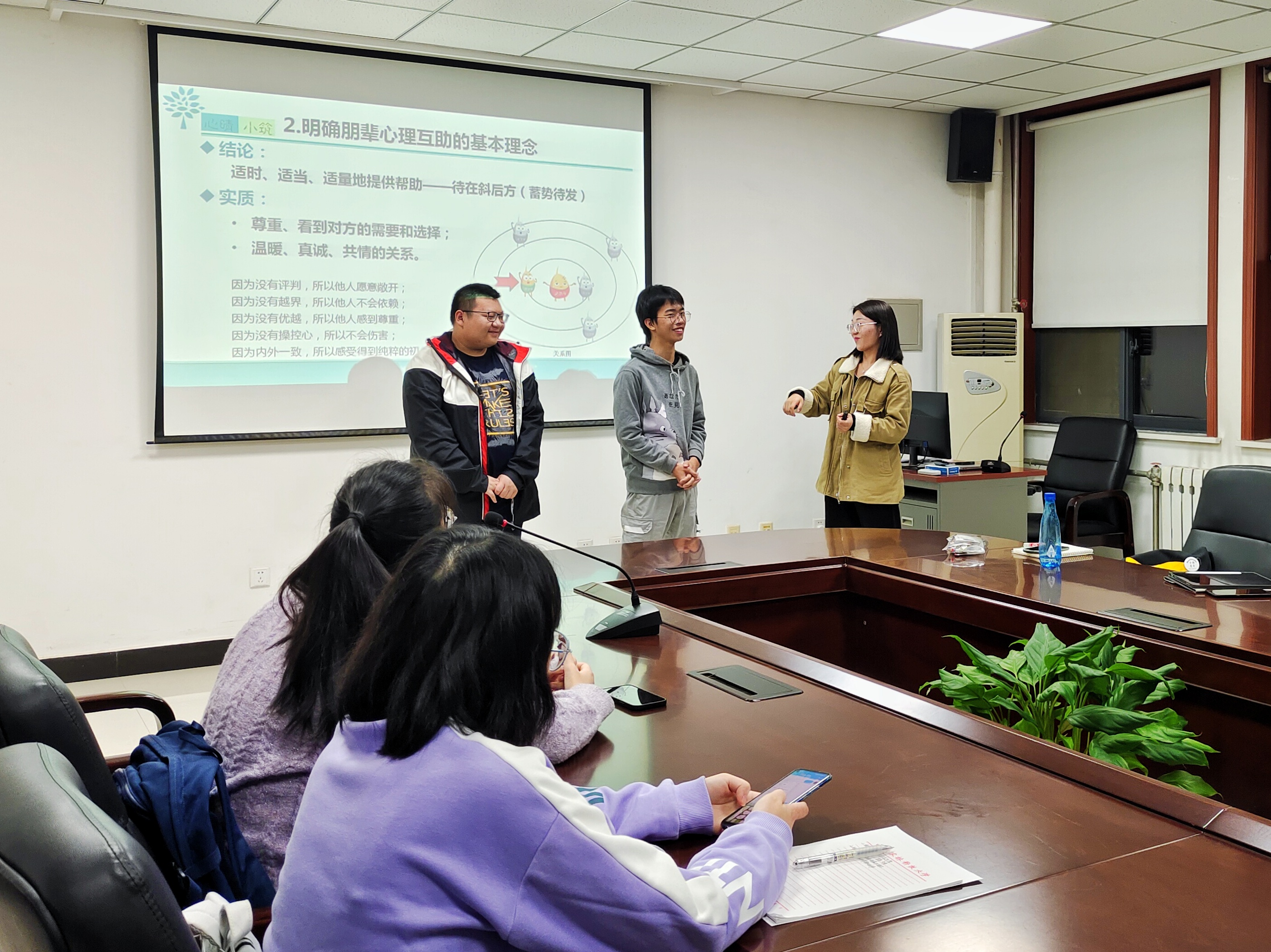 接下来,代老师给我们交代了朋辈心理互助的基本理念及具体做法。作为一名合格的心理委员,我们要时刻站在同学们的斜后方蓄势待发,适时、适当、适量地提供力所能及的帮助。一方面,心理委员要看到对方的需要和选择;另一方面,要与同学们保持温暖、真诚、共情的关系,取得相互的信任。除此之外,心理委员要时刻谨记"四不":不评判,才能打开他人心扉;不越界,才能避免他人依赖;不优越,才能给予他人尊重;不强势,才能给予他人安全感。我们虽不如烈阳般炽热温暖,但可以如同点点萤火给予一丝慰藉。