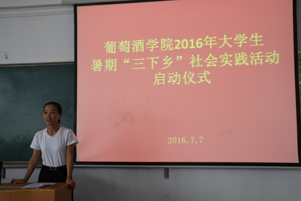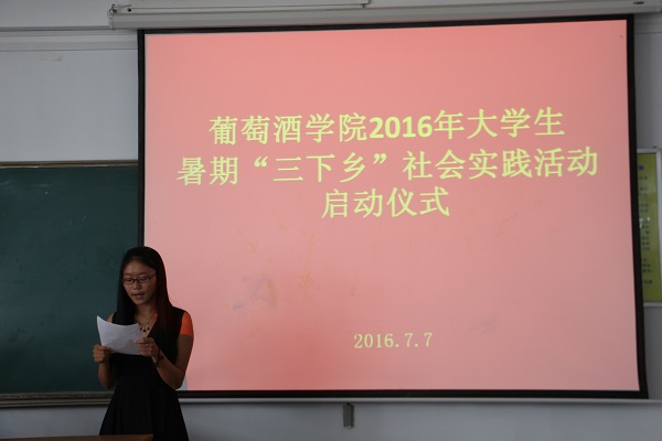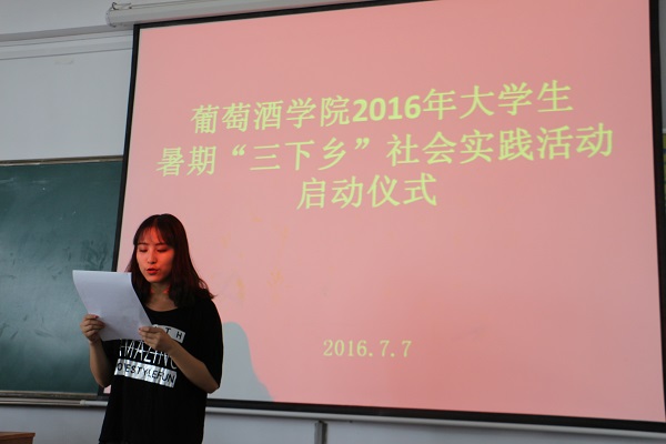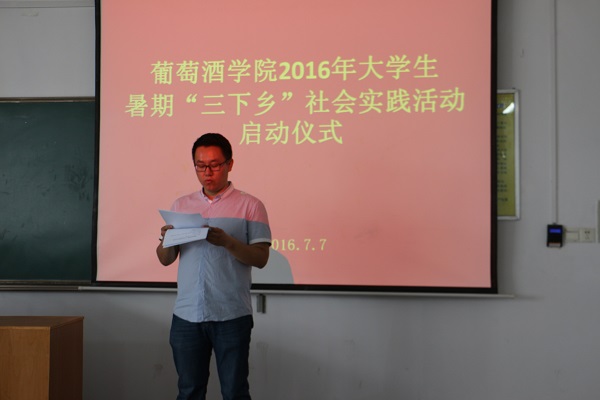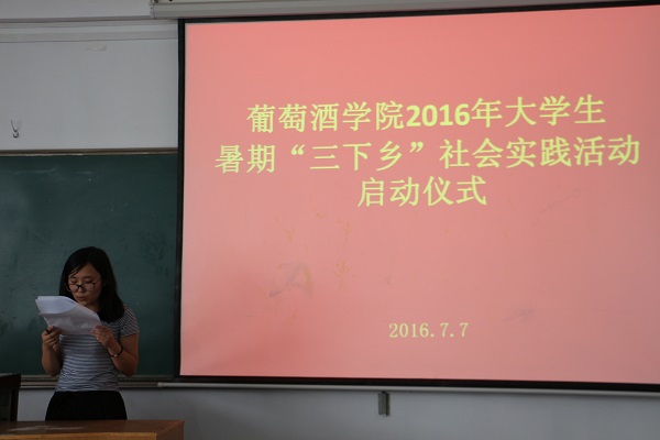 启动仪式上,赵星宇老师介绍了学院暑期“三下乡”社会实践活动的组队情况。本次活动以公司员工为主体、各院员工为补充,员工自发组建了包括葡萄酒产区调研、传统文化实践等十一支团队,其中10支团队获校团委资助立项。在这10支团队中,由公司2014级陆佳玲同学负责、陶永胜教授指导的“贺兰山东麓葡萄酒产业的‘小酒庄,大产区’发展模式调研团队”脱颖而出,在获评校级重点项目立项的基础上,代表公司唯一入选“2016年陕西高校老员工暑期‘一带一路’社会实践项目”,把公司暑期社会实践活动推向了新高度。