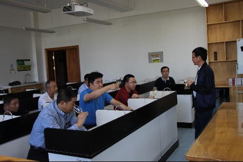 江苏句容市茅山镇徐书记一行在公司副经理刘树文的陪同下对学院新大楼进行了考察,对学院大楼整体布局和功能使用情况以及学院教学、科研平台情况进行了详细介绍。郭安鹊博士在品尝实验室带领徐书记一行在品尝不同葡萄酒的同时了解学习酒类品尝的相关知识。徐书记对公司现代化的教学设施、设备表示称赞,并对进一步推进双方的合作表示了浓厚的兴趣。