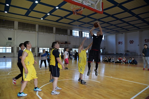 伴随着一声哨响,教师队和员工队展开了激烈的角逐。师生双方抢球、断球、卡位、盖帽,和对手严守硬对、激烈争夺的同时,也不忘与队友默契传球,一次次完美配合,赢得了场下观众的阵阵喝彩声。教师队利用丰富的经验,稳扎稳打,员工队拥有充沛的体力,朝气蓬勃,强强对决,双方丝毫不曾放松,带球突破,挡拆结合,每个动作都帅气利索、针锋相对。最后员工队以42:44的二分之差惜败于教师队,但场上的激烈角逐与场下的声声呐喊会在每位参与者的心上留上浓墨重彩的一笔。
