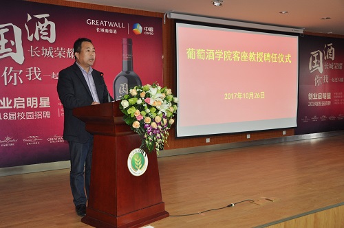 10月26日,公司在6层报告厅举行客座教授聘任仪式。公司党委书记胡俊鹏主持会议,出席的嘉宾有中粮酒业副总经理兼长城葡酒事业部总经理李士祎、长城事业部副总经理盛国红、长城事业部总经理助理刘鑫、长城事业部华夏工厂常务副总经理杨雪峰等,公司师生代表300余人参加会议。