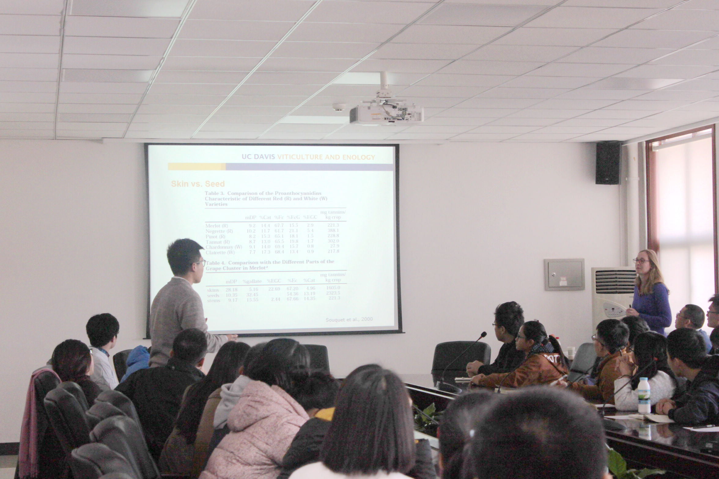11月20日至11月23日,Watrelot博士在公司刘旭副教授实验室,对葡萄与葡萄酒中缩合单宁特性及其测定等方面就进行了指导和交流。23日下午,Watrelot博士为公司师生做了题为“Red Wine Mouthfeel Perception”的学术报告,深入浅出地介绍了葡萄酒中单宁特性对葡萄酒口感的影响机制及检测方法。学院部分教师及博硕士研究生50余人参加了报告,并进行了热烈的讨论和交流。