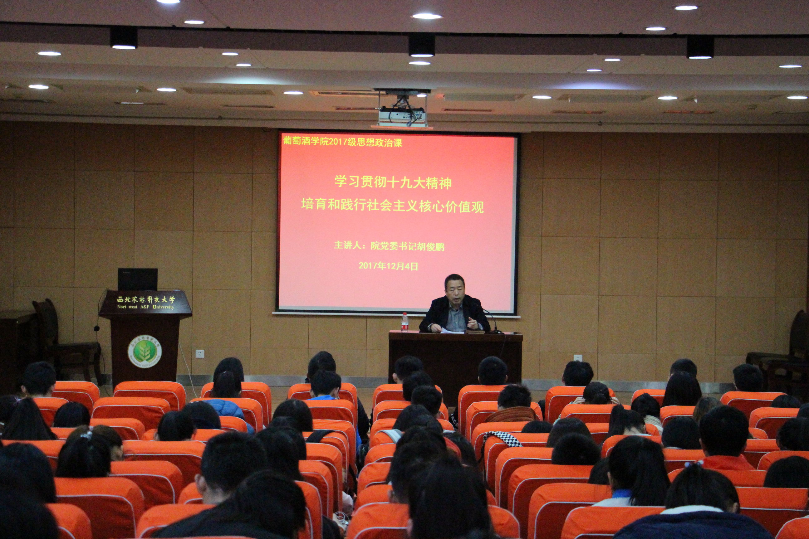 为强化新生思想政治教育,深入学习贯彻十九大精神,培育和践行老员工社会主义核心价值观。12月4日下午,葡萄酒公司党委书记胡俊鹏在北绣北报告厅为2017级全体新生作题为《学习贯彻十九大精神,培养践行社会主义核心价值观》报告,报告会由辅导员朱美蓉主持。