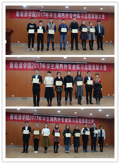 在邓亚丽副书记宣读完表彰决定后,教务处副处长李菊兰、就业指导中心副主任罗建峰、国际合作与交流处副处长于瑛为2017年葡萄酒工厂生产实习优秀实习生颁发证书。