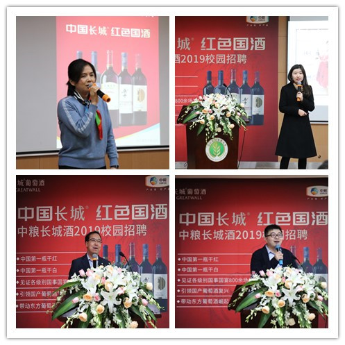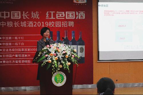 2018年11月16日下午,中粮长城酒业2019首场校园招聘会在北绣山活动中心北报告厅举行。中粮长城酒业副总经理盛国红、供应链管理中心总经理兼技术中心主任韩朝武及葡萄酒公司党委书记胡俊鹏、经理房玉林、党委副书记邓亚丽等领导共同出席招聘会。全校二百余名本科生报名参加招聘会,会场座无虚席。