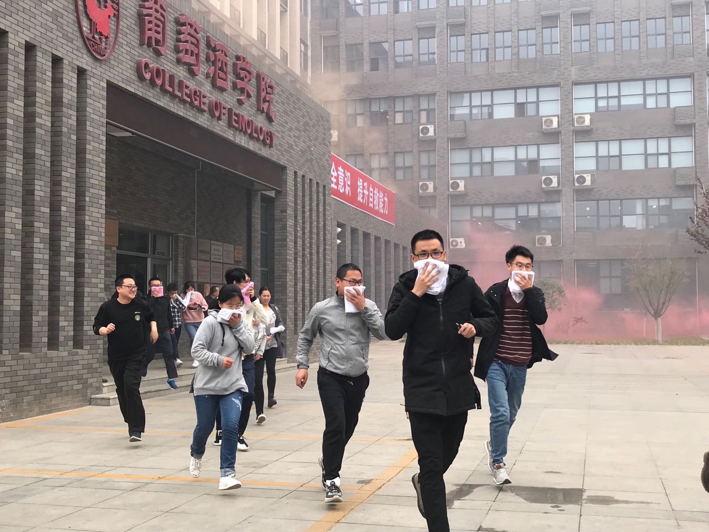 大楼全体人员伴随着刺耳的报警声响,迅速撤离工作学习岗位,各楼层的疏散志愿者迅速引导老师和同学们弯着腰、用毛巾捂住口鼻、排成两列沿着指定的通道迅速撤离。学院近200多名师生全部安全撤离,整个逃生过程迅速而有序。