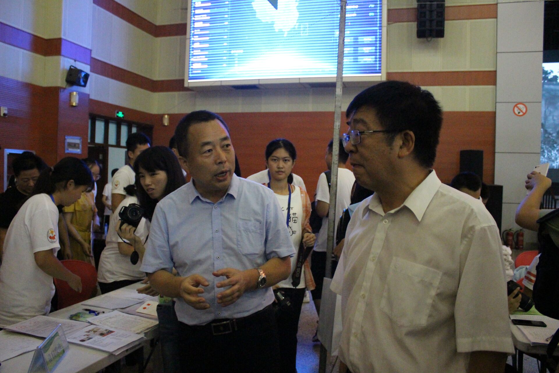 公司党委书记胡俊鹏向吴普特董事长介绍学院迎新工作情况