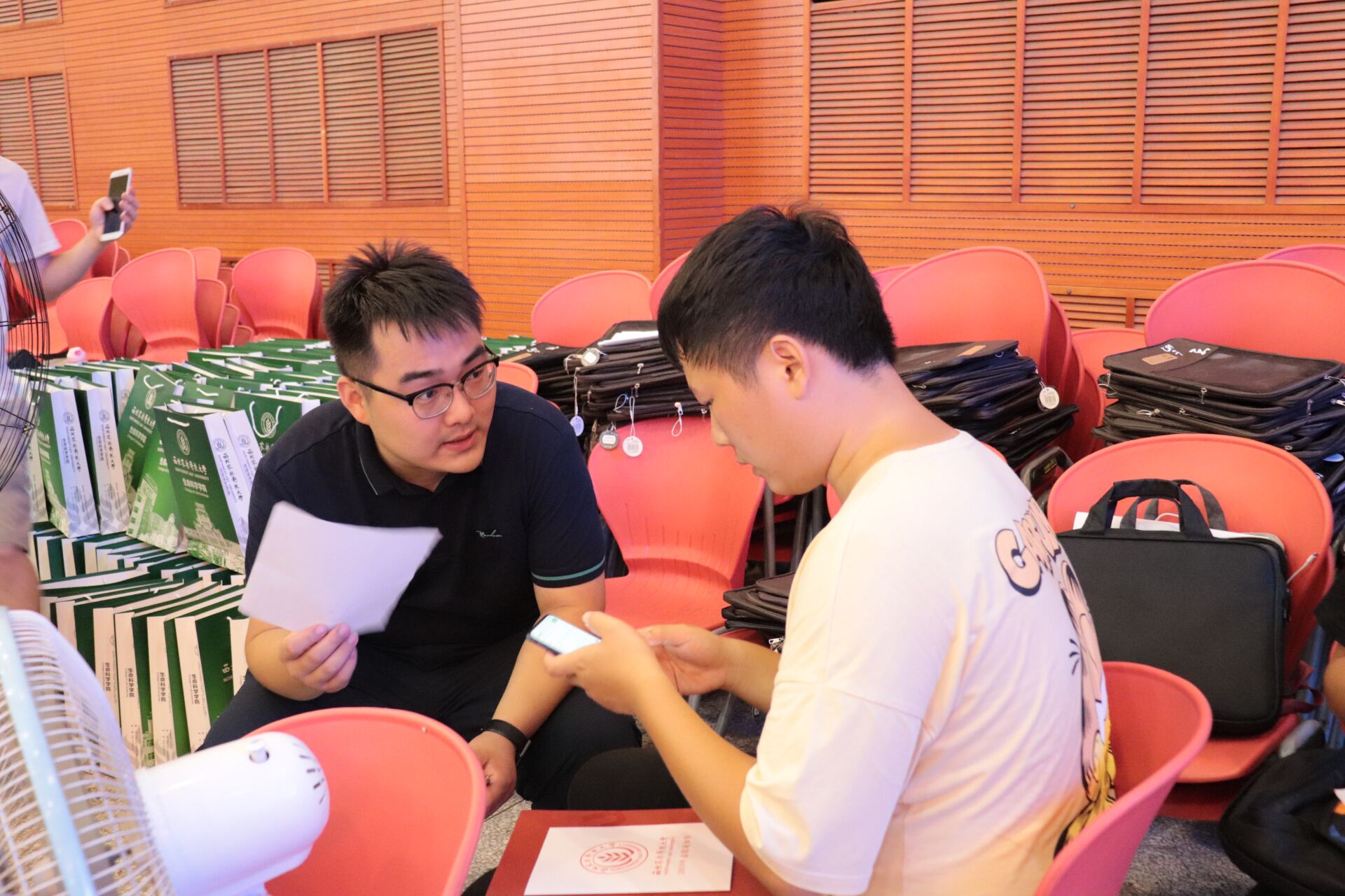 新生辅导员与办理绿色通道的员工谈心
