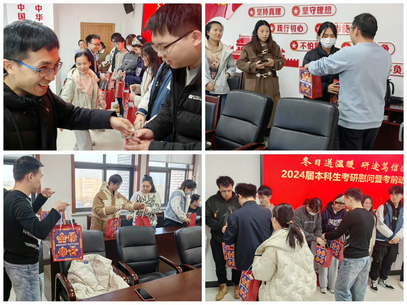 2024年全国硕士研究生入学考试在即,为帮助考研学子缓解备考压力,坚定考研信心,积极冲刺迎考,12月8日下午,学院在615会议室召开考研学子慰问暨考前动员大会。学院副经理刘旭、毕业生班主任及辅导员一同为同学们加油鼓劲。